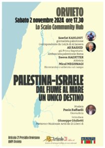 “Palestina-Israele: dal fiume al mare un unico destino” è l’iniziativa di confronto messa in campo dal presidio Orvietano “Giulio Regeni” di Articolo 21 insieme all’ANPI che si terrà Sabato 2 Novembre alle ore 17.30 a “Lo scalo Community Hub” a cui parteciperanno il giornalista palestinese corrispondente da Gaza di Al Jazeera Sawfat Kahlout, l’attivista Sveva Haertter, la ricercatrice e attivista sul campo Micol Meghnagi e Ali Rashid, già Primo segretario dell’Ambasciata Palestinese a Roma.