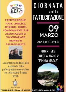 Il 9 marzo alla pineta Mazza di Anzio le associazioni riunite in “PartecipaRete” daranno vita ad una giornata dedicata alla riscoperta della “Partecipazione” come valore per accrescere il senso civico ed il rispetto dei beni comuni, della legalità, della convivenza civile, ripudiando qualsiasi forma di violenza e sopraffazione. Obiettivi che le associazioni perseguono con azioni ed interventi sul territorio, con i cittadini- giovani e meno giovani- donando il proprio tempo libero, per riscattare i quartieri dal degrado sottraendoli dalle mani della criminalità.