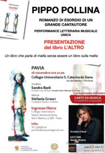 Il Presidio di Libera Pavia Rossella Casini Marcella Di Levrano, invita a partecipare il 16 novembre 2025 presso il Collegio Universitario Santa Caterina da Siena, alle 21.00 all’incontro con Pippo Pollina che presenterà il suo romanzo d’esordio: “L’Altro”, in un incontro letterario-musicale unico.