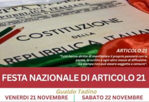 A seguire la presentazione del libro di Angela Iantosca sulle madri costituenti. mentre sabato, alle ore 17, al teatro Talia l’evento “Report e non solo” con Paolo Mondani, inviato di Report, Roberto Natale, consigliere di amministrazione Rai, Massimiliano Presciutti, sindaco di Gualdo e presidente Provincia, Beppe Giulietti, coordinatore di Articolo 21.