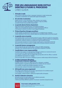 Da ultimo, ispirandosi al Manifesto dell’Associazione Parole O’Stili, gli Osservatori hanno varato Le Linee guida per un linguaggio non ostile, dentro e fuori il processo. L’elaborato sarà discusso in varie forme e sedi. E’ una base di partenza e non di approdo. Vuole essere il grimaldello per spalancare la porta alla consapevolezza che occorre avere grande cura delle parole. A questo scopo, bisogna essere consapevoli che nel percorso della decisione e in generale del ragionamento, le emozioni hanno una parte fondamentale. Camuffarle anziché prenderne consapevolezza è esattamente l’operazione idonea a permettere agli stereotipi di acquisire il dominio del percorso decisionale.
