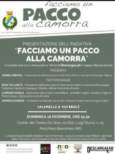 Domenica 18 dicembre alle ore 19.30 presso il porticato del teatro De Sica in via Don Luigi Sturzo 25 ci sarà la presentazione dell’iniziativa “Facciamo un pacco alla camorra”, a cura dell’associazione ‘Vedo Sento Parlo in memoria di Giuseppe Tallarita’.