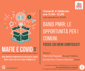 L’appuntamento è per il 4 febbraio dalle ore 11.00 alle ore 12.00 con il webinar dal titolo “Bandi PNRR: le opportunità per i comuni. Focus sui beni confiscati”.