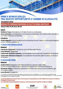 Si aprono giovedì 30 marzo dalle 14.30 alle 18.30 le due sessioni di webinar al titolo “Pnrr e bonus edilizi: tra nuove opportunità e ombre di illegalità”.
