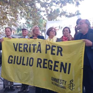 È una storia umana e processuale che fino ad oggi è andata avanti tra grandi difficoltà, ma quella piccola folla davanti al Tribunale è la prova che si può e si deve andare avanti. Il sit in organizzato da Articolo 21 insieme alla Fnsi e all’Ordine dei Giornalisti vuole tenere accesi i riflettori per evitare l’oblio, comodo, che invece cercano i colpevoli. “Noi saremo di nuovo qui e ovunque vorranno i genitori di Giulio – dice il Presidente della Fnsi, Giuseppe Giulietti – e non consentiremo che l’oscurità avvolga questo caso. Continueremo a cercare verità e giustizia insieme alla famiglia Regeni”.