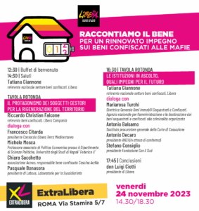 L’evento nazionale si terrà venerdì 24 novembre 2023, a Roma, presso la nuova sede di Libera in Via Stamira 5/7, alle 14:30 e vedrà le associazioni, i soggetti gestori dei beni e la cittadinanza confrontarsi attorno al tema dei beni confiscati.
