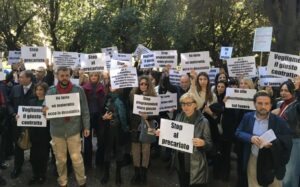 Il presidio, davanti alla sede Rai, è stato animato dai giornalisti che lavorano nei principali programmi di informazione della tv pubblica, ma non hanno il contratto di lavoro giornalistico: autori, programmisti registi, programmisti multimediali, ‘artisti’, alcuni dei quali hanno raccontato la loro storia – che è la storia di troppi giornalisti italiani – sventolando cartelli come ‘Giornalisti di fatto senza giusto contratto’, ‘Stop al precariato’ , ‘Stop programmisti senza giusto contratto’, ‘Né ferie né maternità ma quale denatalità’.
