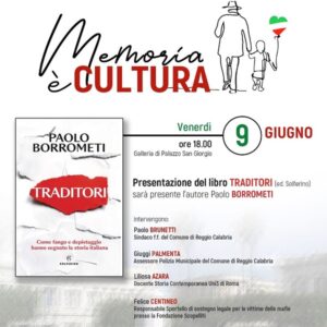 Si svolgerà venerdì 9 giugno alle 18:00, nella Galleria di Palazzo San Giorgio, sede del Comune di Reggio Calabria, la presentazione del libro “Traditori”, del giornalista Paolo Borrometi.