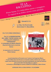 “Te la racconto: Pietro Sanua, un sindacalista onesto e coraggioso. Le ragioni di un delitto ancora senza giustizia”.