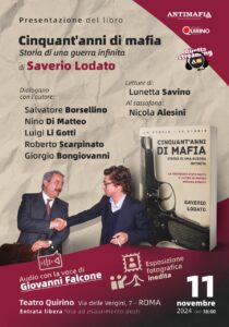 Lunedì 11 novembre si terrà a Roma, alle ore 18, presso il Teatro Quirino di Roma (Via delle Vergini, 7), la presentazione del libro “Cinquant’anni di mafia” (edito dalla Bur-Rizzoli) scritto dal giornalista Saverio Lodato.