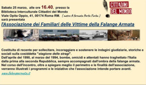 Sabato 25 marzo alle ore 16.40 presso la Biblioteca Interculturale “Cittadini del Mondo”, in Viale Opita Oppio 41 a Roma, sarà presentata l’Associazione dei Familiari delle Vittime della Falange Armata.