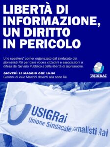 Uno speakers’ corner nei Giardini di viale Mazzini organizzato dall’UsigRai per giovedì 16 maggio dalle 10.30 è il modo con cui l’UsigRai torna e insiste sulla necessità di tenere i riflettori accesi su ciò che sta succedendo alla più grande azienda culturale del paese. Ma anche un modo per dare voce a cittadini, associazioni, giornalisti sullo stato di salute complessivo della libertà di espressione in Italia.