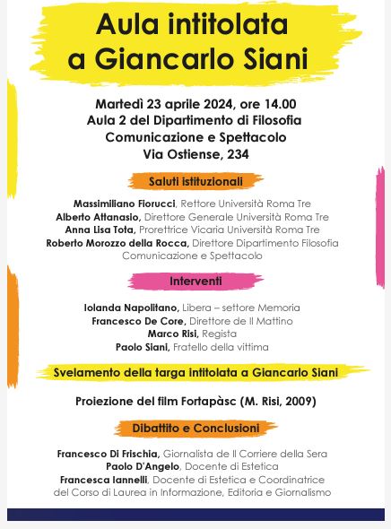 Martedì 23 aprile 2024 alle ore 14.00, presso l’Aula 2 del Dipartimento di Filosofia, Comunicazione e Spettacolo (Via Ostiense, 234), si terrà un evento organizzato in occasione dello svelamento della targa intitolata a Giancarlo Siani.