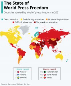 The country that fell the furthest in 2021 was Malaysia (down 18 at 119th), where the problems include a recent “anti-fake news” decree allowing the government to impose its own version of the truth. Big descents were also registered by Comoros (down 9 at 84th) and El Salvador (down 8 at 82nd), where journalists have struggled to obtain state-held information about the government’s handling of the pandemic.