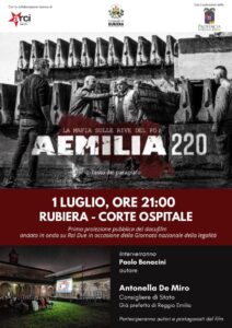 Martedì 1 Luglio 2025, dalle 21:00 alle 23:00, il Comune di Rubiera organizza la prima proiezione pubblica del docufilm “Aemilia 220”, di Paolo Bonacini per la regia di Claudio Canepari e Giuseppe Ghinami, andato in onda su Rai Due in occasione della Giornata nazionale della legalità.