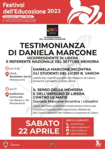 Sabato 22 aprile all’interno del Festival dell’Educazione di Montevarchi, ospiteremo la Vice Presidente di Libera Contro le Mafie e Referente Nazionale dei familiari delle vittime innocenti delle mafie Daniela Marcone.