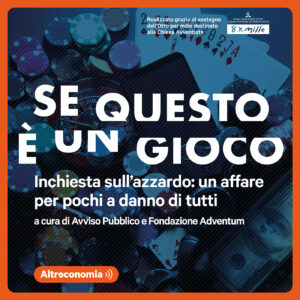 Il tema dell’azzardo è insomma un tema ampio e complesso. Un podcast, realizzato da Avviso Pubblico e dalla Fondazione Adventum, e distribuito da Altreconomia, ci permette di fare un viaggio all’interno di questo fenomeno. In 15 puntate il giornalista Antonio Massariolo ci spiega quanto il gioco d’azzardo sia subdolo e quanto, anche dal punto di vista politico, questa tematica sia stata sempre sottovalutata.