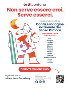 È entrata nel vivo la campagna di reclutamento di volontari e volontarie che a fine gennaio, fra il 26 e il 29, supporteranno il censimento e la conta delle persone senza dimora in tutta Italia nelle 14 città metropolitane. Già circa mille persone si sono registrate nell’apposita piattaforma, ma l’obiettivo è quello di raggiungere 10.000 registrazioni.