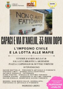 Il Comune di Settimo Torinese (To) il prossimo 21 marzo alle 18 proporrà un incontro dal titolo: «Capaci e via D’Amelio, 33 anni dopo. L’impegno civile e la lotta alle mafie»