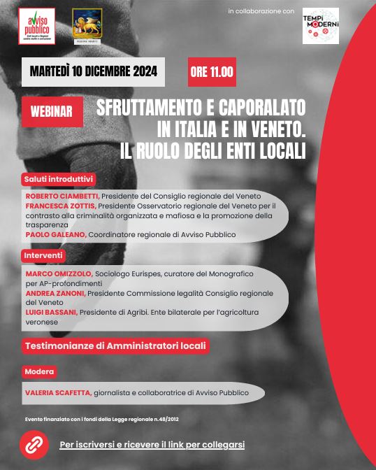 “Sfruttamento e caporalato in Italia e in Veneto. Il ruolo degli enti locali” è il titolo del webinar organizzato da Avviso Pubblico e Regione del Veneto in collaborazione con l’associazione Tempi moderni.