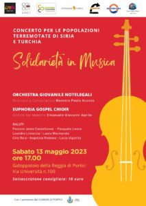 Sabato 13 maggio alle 17 il Galoppatoio della Reggia di Portici, in provincia di Napoli, ospiterà l’evento “Solidarietà in Musica”, un concerto benefico che raccoglierà fondi per le popolazioni terremotate.