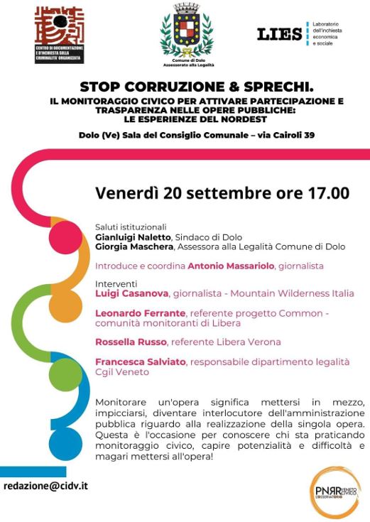 L’incontro del 20 settembre – promosso dal Centro di documentazione ed inchiesta sulla criminalità organizzata in Veneto e dal Laboratorio dell’inchiesta economica e sociale, assieme al Comune di Dolo – è l’occasione per conoscere chi sta praticando monitoraggio civico, capire potenzialità e difficoltà di questo strumento e magari mettersi all’opera!