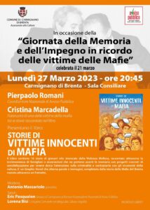 In occasione della XXVIII “Giornata regionale della memoria e dell’impegno in ricordo delle vittime innocenti delle mafie”, il Comune di Carmignano di Brenta ha organizzato per lunedì 27 marzo alle 20.45, presso la Sala Consiliare del Municipio, la presentazione della graphic novel Avviso Pubblico, “Storie di vittime innocenti di mafia” (BeccoGiallo Editore, 2021), scritta da Valeria Scafetta, con la collaborazione di Giulia Migneco, le illustrazioni di Dorilys Giacchetto e i fumetti di Elleni. Il libro è realizzato anche grazie al cofinanziamento della Regione del Veneto.