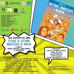 Il Comune di Zero Branco, in provincia di Treviso, organizza per venerdì 28 ottobre, alle ore 20.30, presso l’Auditorium comunale, la presentazione della graphic novel di Avviso Pubblico, “Storie di vittime innocenti di mafia” (BeccoGiallo Editore, 2021), scritta da Valeria Scafetta con la collaborazione di Giulia Migneco, le illustrazioni di Dorilys Giacchetto e i fumetti di Elleni.