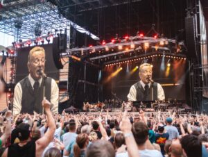 La bandiera americana fissata in cima a tutto, quasi invisibile a chi osservi solo il palco. Ma certificato universale, testimone solenne per chi sa di potere a buon diritto rivendicare l’ identità e storia di popolo scritta in quella bandiera, da “Born in the Usa” a “The Rising” a “The Ghost of Tom Joad”.