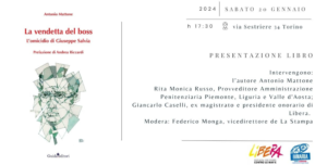 All’incontro interverranno l’autore Antonio Mattone, Rita Monica Russo, Provveditore Amministrazione Penitenziaria Piemonte, Liguria e Valle d’Aosta, e Giancarlo Caselli, ex magistrato e presidente onorario di Libera.