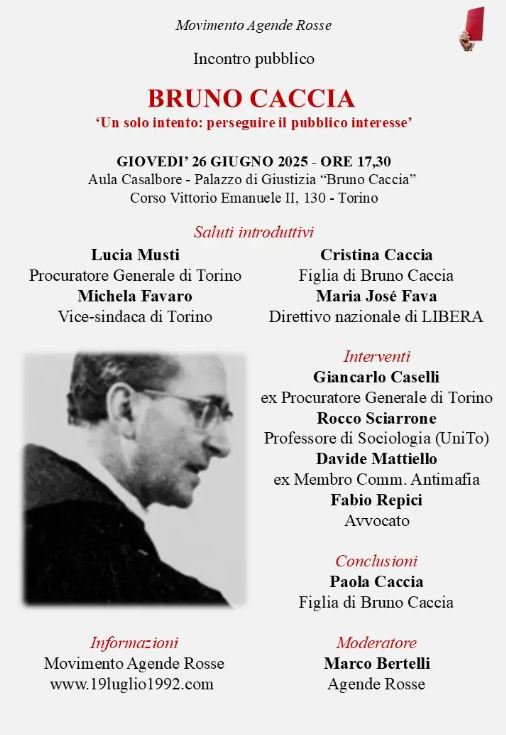 Giovedì 26 giugno 2025 avrà luogo a Torino l’incontro dal titolo “Bruno Caccia, un solo intento: perseguire il pubblico interesse”. L’evento avrà luogo alle ore 17.30 presso l’Aula Casalbore del Palazzo di Giustizia di Torino (C.so Vittorio Emanuele II, 130) ed è promosso dal Movimento Agende Rosse.