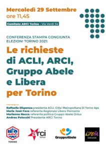 Mercoledì 29 settembre saremo in conferenza stampa congiunta con Arci Torino, Acli Torino e Libera Piemonte per presentare le nostre richieste ai candidati sindaci della città.