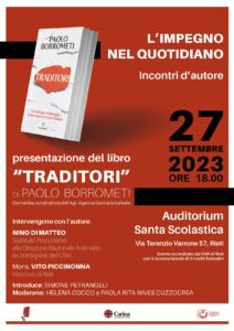 Un’iniziativa che prenderà avvio alle 18 e avrà ad oggetto la presentazione del nuovo libro Traditori del giornalista e scrittore Paolo Borrometi, condirettore Agi, presidente di Articolo21 e che sul suo sito indipendente La Spia.it denuncia ormai da anni gli intrecci tra mafia e politica e gli affari sporchi che fioriscono all’ombra di quelli legali.