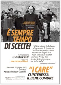 È su questi presupposti che la Diocesi di Nuoro e Lanusei, per volere del Vescovo Mons. Antonello Mura, ospiterà Don Luigi Ciotti a Nuoro mercoledì 28 giugno 2023 alle ore 18,30 presso il Teatro San Giuseppe. L’iniziativa è promossa dall’Ufficio di Pastorale Sociale e del Lavoro della Diocesi di Nuoro e della Diocesi di Lanusei.