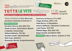 In preparazione alla Festa della Liberazione un incontro di approfondimento promosso da Articolo 21 – d’intesa e in collaborazione con Articolo 21 FVG, Assostampa FVG e Ordine dei Giornalisti FVG – e Rete Dasi Fvg avrà luogo giovedì 22 aprile alle ore 17.30.