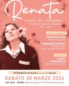 L’iniziativa, intitolata “Renata, fonte di coraggio. 40 anni di memoria e impegno. 1984-2024”, avrà luogo presso il Mercato Coperto in via M. Ricchiuto a Gemini, frazione di Ugento (LE).