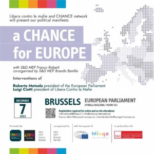 Una Chance per l’Europa: i 5 punti e le 12 proposte del Manifesto politico di Libera e delle associazioni della società civile europea riunite nella rete CHANCE – Civil Hub Against orgaNised Crime in Europe, saranno presentati giovedì 7 dicembre dalle 10.30 alle 13.30 presso l’Edificio Spinelli del Parlamento europeo, nella sala 2g3. Saranno presenti Roberta Metsola, Presidente del Parlamento europeo, Luigi Ciotti, Presidente di Libera , eurodeputati e rappresentanti della società civile.
