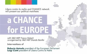 Una Chance per l’Europa: i 5 punti e le 12 proposte del Manifesto politico di Libera e delle associazioni della società civile europea riunite nella rete CHANCE – Civil Hub Against orgaNised Crime in Europe, saranno presentati giovedì 7 dicembre dalle 10.30 alle 13.30 presso l’Edificio Spinelli del Parlamento europeo, nella sala 2g3. Saranno presenti Roberta Metsola, Presidente del Parlamento europeo, Luigi Ciotti, Presidente di Libera , eurodeputati e rappresentanti della società civile.