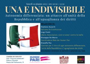 Presso la sala Matteotti della Camera dei Deputati, dalle ore 10:30 alle 13:30, si terrà l’iniziativa “Una e indivisibile. Autonomia differenziata: un attacco all’unità della Repubblica e all’uguaglianza dei diritti”.