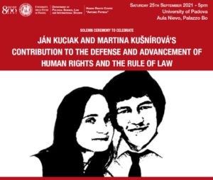 Sabato 25 settembre alle 17, nell’aula Nievo di Palazzo Bo dell’Università di Padova, cerimonia in onore di Jan Kuciak e Martina Kusnirova, il giornalista investigativo slovacco e la sua fidanzata assassinati il 21 febbraio 2018 nel loro appartamento di Velka Maca, a 65 chilometri da Bratislava.