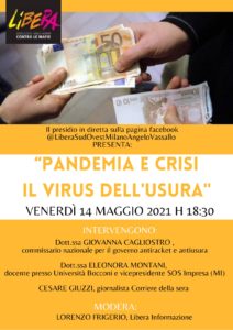 Il presidio di Libera sud-ovest Milano “Angelo Vassallo” organizza per venerdì 14 maggio, ore 18:30 l’evento Pandemia e crisi. Il virus dell’usura.