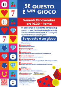 Venerdì 19 novembre, a Roma, presso la Sala Tirreno della Regione Lazio (via Rosa Raimondi Garibaldi, 7), alle ore 10.30, si svolgerà la presentazione di Se questo è un gioco, un progetto sperimentale realizzato da Avviso Pubblico e da Fondazione Adventum, attraverso il portale web www.sequestoeungioco.org.