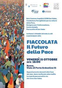 L’appuntamento è per venerdì 25 ottobre alle ore 18:00 a San Saba per una manifestazione di cittadini per la Pace. Una fiaccolata percorrerà le strade del rione dalla Casa del Jazz, bene confiscato alla mafia e ora bel contesto di ricche iniziative musicali e culturali a ridosso delle Mura Aureliane, fino alla basilica di San Saba, senza gonfaloni né partiti ma con una grande bandiera arcobaleno.