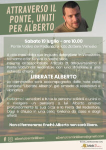 Sabato 19 luglio alle ore 10, un gruppo di amici di Alberto con l’associazione Art. 21 percorreranno il Ponte Votivo del Redentore con uno striscione e una richiesta chiara e accorata: “Liberate Alberto”. L’azione sarà accompagnata dalle note dell’omonima canzone scritta per lui e già diventata inno di resistenza e vicinanza.