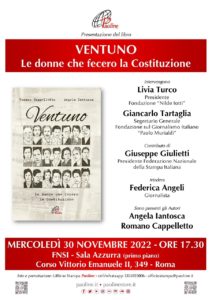 Mercoledì 30 novembre 2022, alle 17.30, la sala Azzurra della Fnsi (al primo piano della sede in corso Vittorio Emanuele II, 349 a Roma) ospita la presentazione del libro di Angela Iantosca e Romano Cappelletto “Ventuno. Le donne che fecero la Costituzione” (Paoline, 2022).