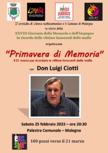 Il percorso sul territorio camuno inizia sabato 25 febbraio in Palestra a Malegno, con l’incontro con don Luigi Ciotti, fondatore di Libera, alle 20:30. Don Luigi ritorna a Malegno su invito di Libera Vallecamonica per una serata di pensiero sull’attualità e di stimolo sul tema della Memoria contro le mafie.