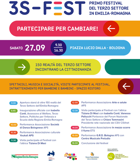 Tutto esaurito per il primo Festival del Terzo settore in Emilia-Romagna dal titolo Partecipare per cambiare. Oltre 150 realtà del sociale saranno presenti in piazza Lucio Dalla a Bologna, provenienti dall’intero territorio regionale. Tutta la giornata sarà dedicata al mondo del volontariato e del sociale, tra spettacoli, incontri e dibattiti, con l’organizzazione curata da Regione Emilia-Romagna, Anci Emilia-Romagna, Forum regionale del Terzo settore e Confederazione nazionale dei centri di servizio per il Volontariato dell’Emilia-Romagna.