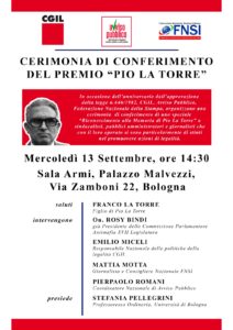 VII° edizione “Premio Pio La Torre”: appuntamento il 13 settembre a Bologna